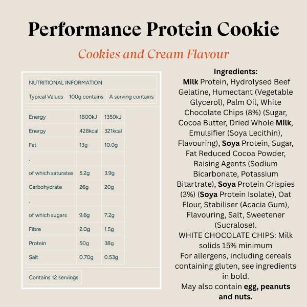 White Chocolate Almond Flavour: Milk Protein, Hydrolysed Beef Gelatine, Humectant (Vegetable Glycerol), Palm Oil, White Chocolate Chips (9%) (Sugar, Cocoa Butter, Whole Milk Powder, Emulsifier (Soya Lecithin), Flavouring), Soya Protein, Oat Flour, Sugar, Stabiliser (Gum Acacia), Raising Agents (Sodium Bicarbonate, Potassium Bitartrate), Flavouring, Salt, Sweetener (Sucralose). WHITE CHOCOLATE CHIPS: Milk Solids 15% Minimum.